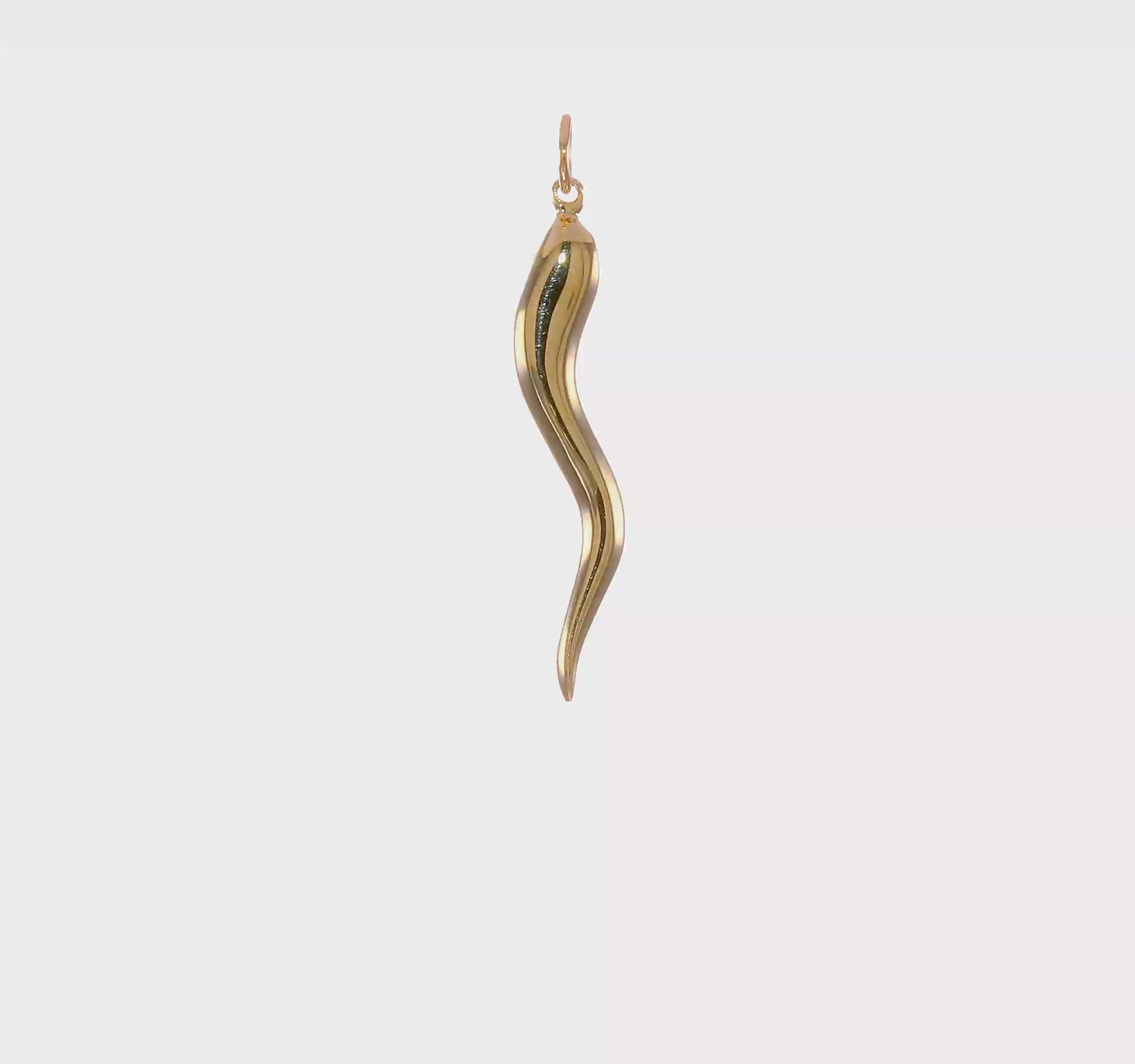 Attract good fortune with the Gold Extra Large 3D Italian Horn Charm - Model A2699. This bold charm showcases the traditional Italian horn in a striking three-dimensional design. Crafted in 14K gold, its extra-large size commands attention. This cornicello charm symbolizes luck and protection, making it a perfect statement piece. Tarnish-free and hypoallergenic. Dimensions: Height: 40 mm/ 1.58 in, Width: 5 mm/ .2 in, Avg. Weight: 4.23 grams.