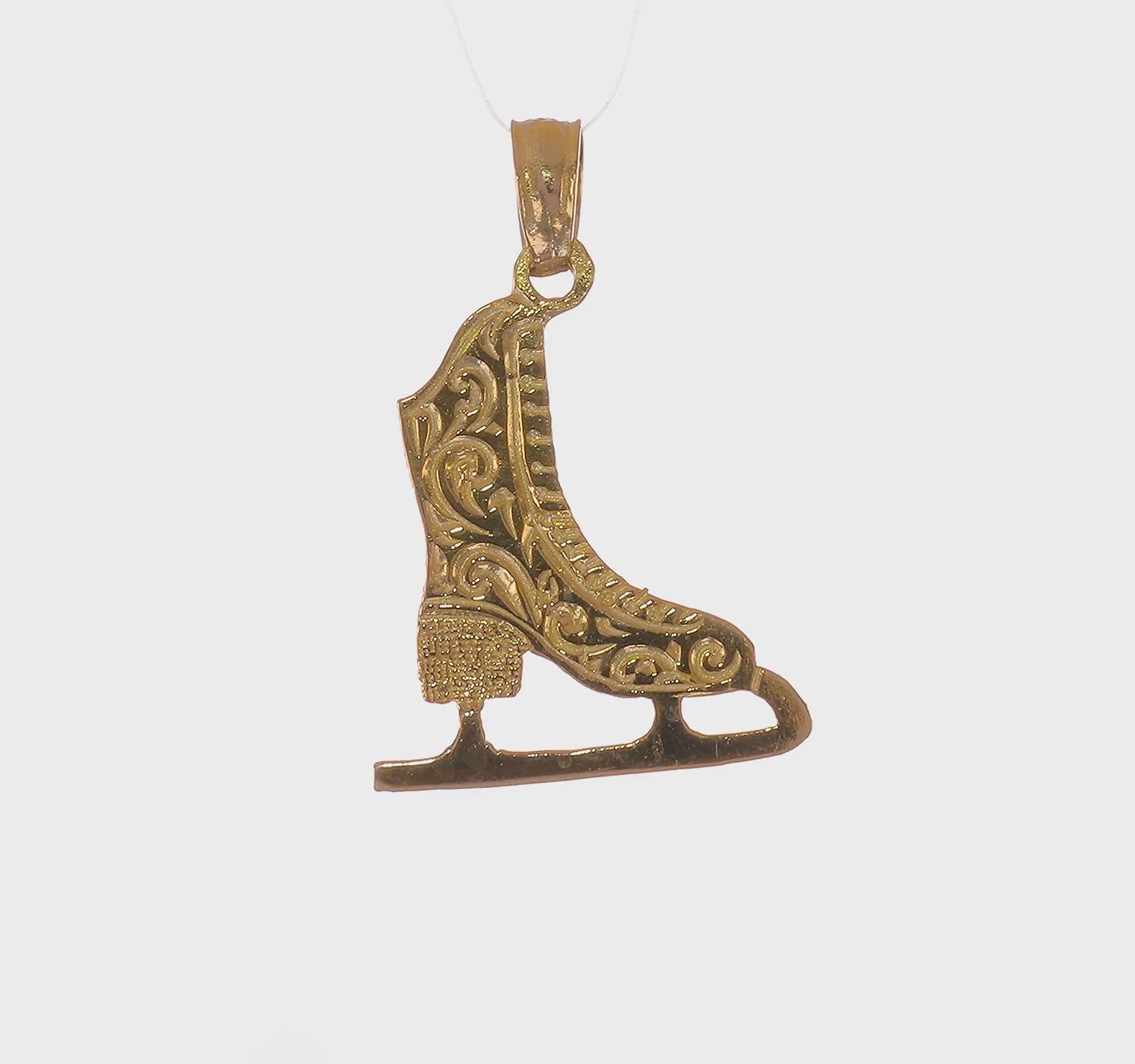 The Gold Figure Skate Pendant is crafted from genuine 14K solid gold, featuring a finely detailed figure skate with realistic boot and blade accents. Measuring 20mm tall and 13mm wide, this pendant shines with a high-polish finish and textured, elegant contours. The figure skate pendant captures the artistry and grace of ice skating, making it a meaningful accessory for skaters and fans alike. As a symbol, the skate represents dedication, passion, and the pursuit of excellence on and off the ice. Tarnish-free and hypoallergenic, this gold figure skate pendant is perfect for everyday wear or as a thoughtful gift for anyone who loves skating.