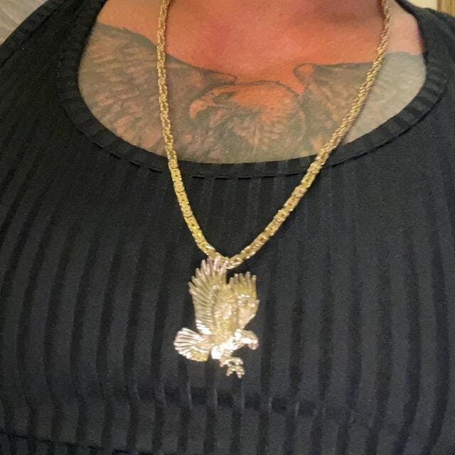 The Gold Large Flying Eagle Pendant is expertly crafted from genuine 14K solid gold, showcasing a majestic eagle in mid-flight with wings fully outstretched and intricate feather detailing. Measuring 42mm tall and 30mm wide, this bold pendant shines with a rich golden hue and lifelike design. The eagle is a powerful symbol of strength, courage, freedom, and vision, making this gold eagle pendant a meaningful accessory for anyone seeking inspiration and resilience. Tarnish-free and hypoallergenic, it’s a standout piece for everyday wear or as a remarkable gift for those who appreciate the spirit of the eagle.