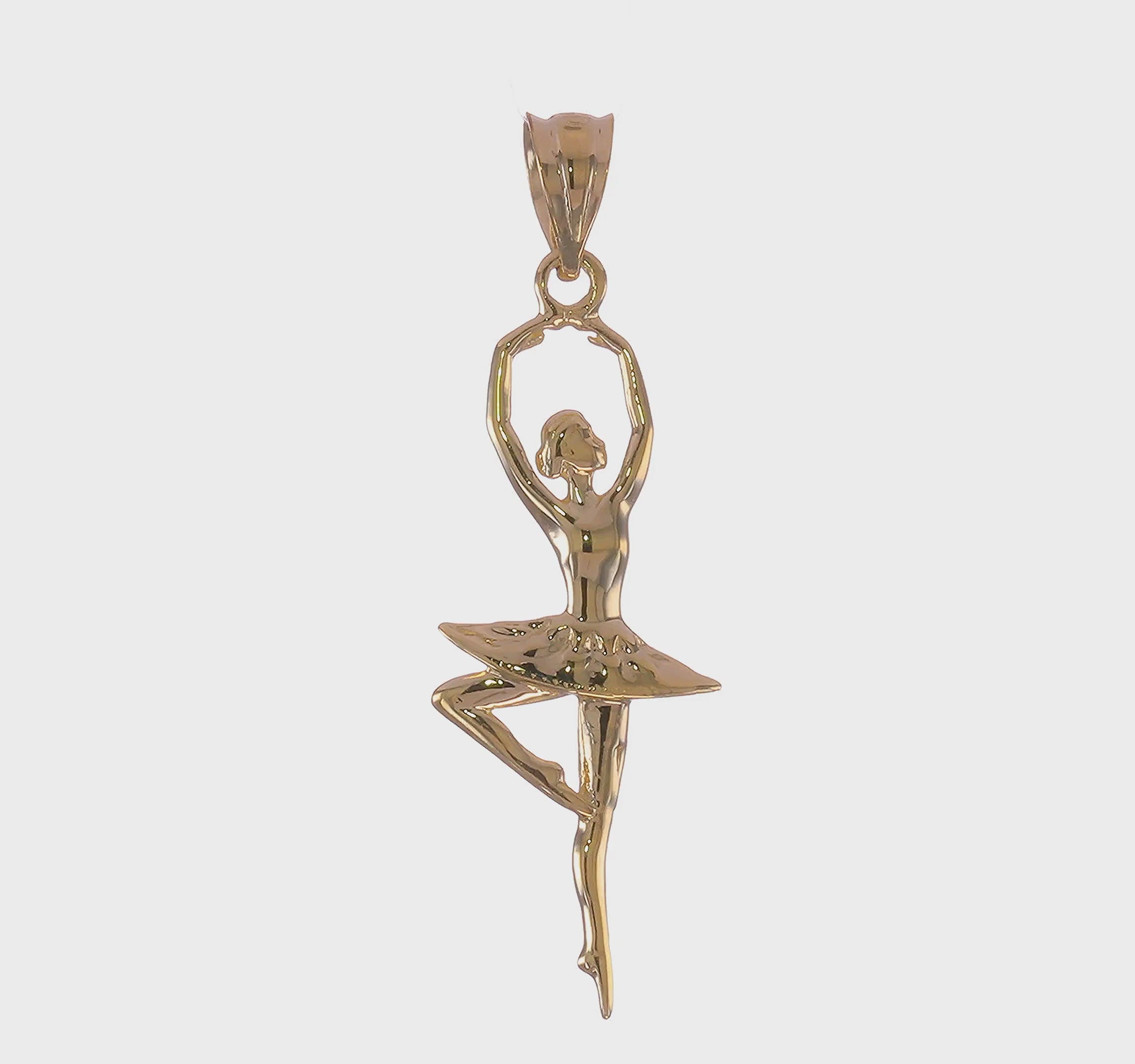 The Gold Large Ballerina Pendant is crafted from genuine 14K solid gold, featuring a beautifully detailed ballerina in a poised dance position. Measuring 27.7mm tall and 8.5mm wide, this pendant shines with a high-polish finish that highlights the graceful lines and elegant posture of the dancer. The ballerina is a timeless symbol of artistry, dedication, and the pursuit of excellence, making this gold ballerina pendant a meaningful accessory for dancers and anyone inspired by the beauty of ballet. Tarnish-free and hypoallergenic, it’s perfect for everyday wear or as a thoughtful gift for ballet jewelry lovers.