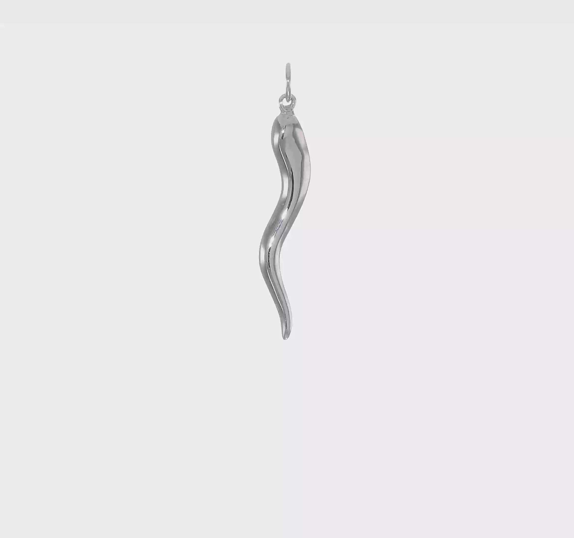 Celebrate good fortune with the 14K White Gold Extra Large 3D Italian Horn Charm - Model M2428. This cornicello pendant, crafted in sleek 14k white gold, showcases the iconic Italian horn in a bold, three-dimensional design. Symbolizing protection and good luck, it's a unique addition to any jewelry collection and an ideal gift. Tarnish-free and hypoallergenic. Dimensions: 40 mm height, 5 mm width.