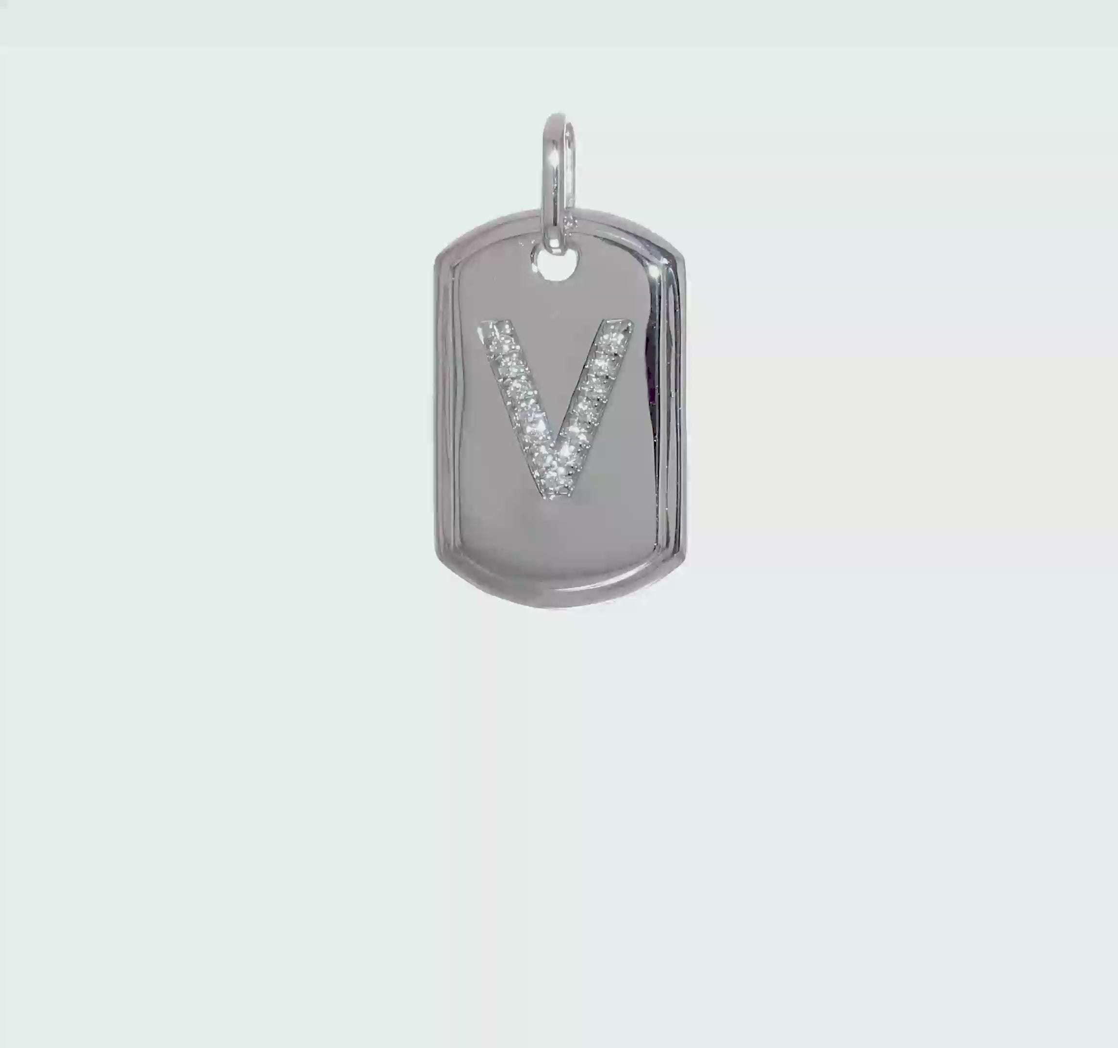 White 14K Gold Initial "V" Dog Tag Pendant With Diamonds