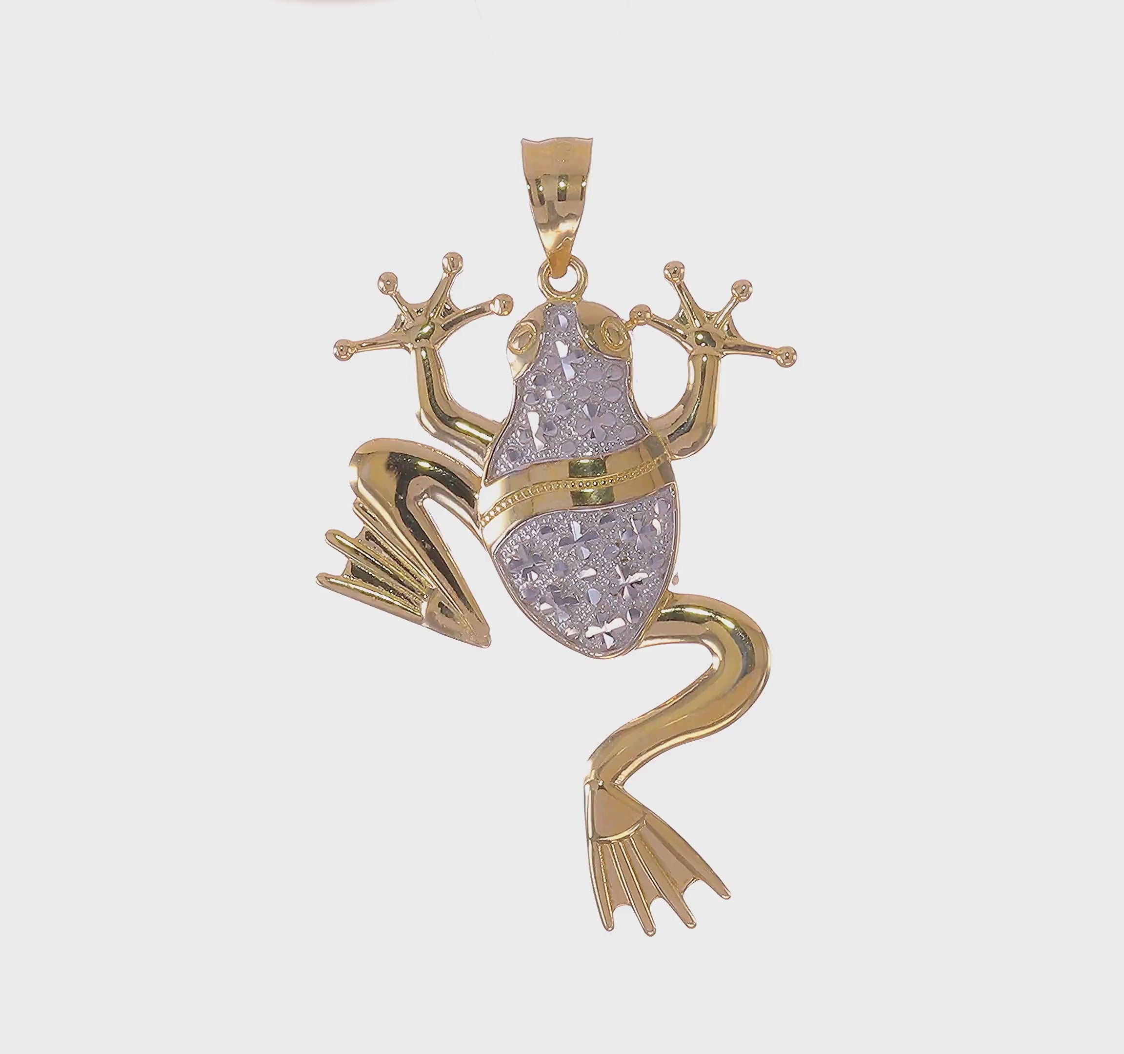 The Yellow and White Gold Diamond-Cut Extra Large Frog Pendant is crafted from genuine 14K yellow and white gold, featuring a lifelike frog brought to life with a brilliant diamond-cut finish. The two-tone design highlights the frog’s natural contours, with yellow gold accentuating the body and white gold adding striking contrast to the details. Measuring 49mm tall and 32mm wide, this statement pendant shimmers as it catches the light, showcasing intricate textures and dynamic depth. In jewelry, the frog is a symbol of transformation, renewal, and good fortune, making this gold frog pendant both a bold accessory and a meaningful talisman. Tarnish-free and hypoallergenic, it’s perfect for animal jewelry lovers or anyone seeking a unique, eye-catching piece.
