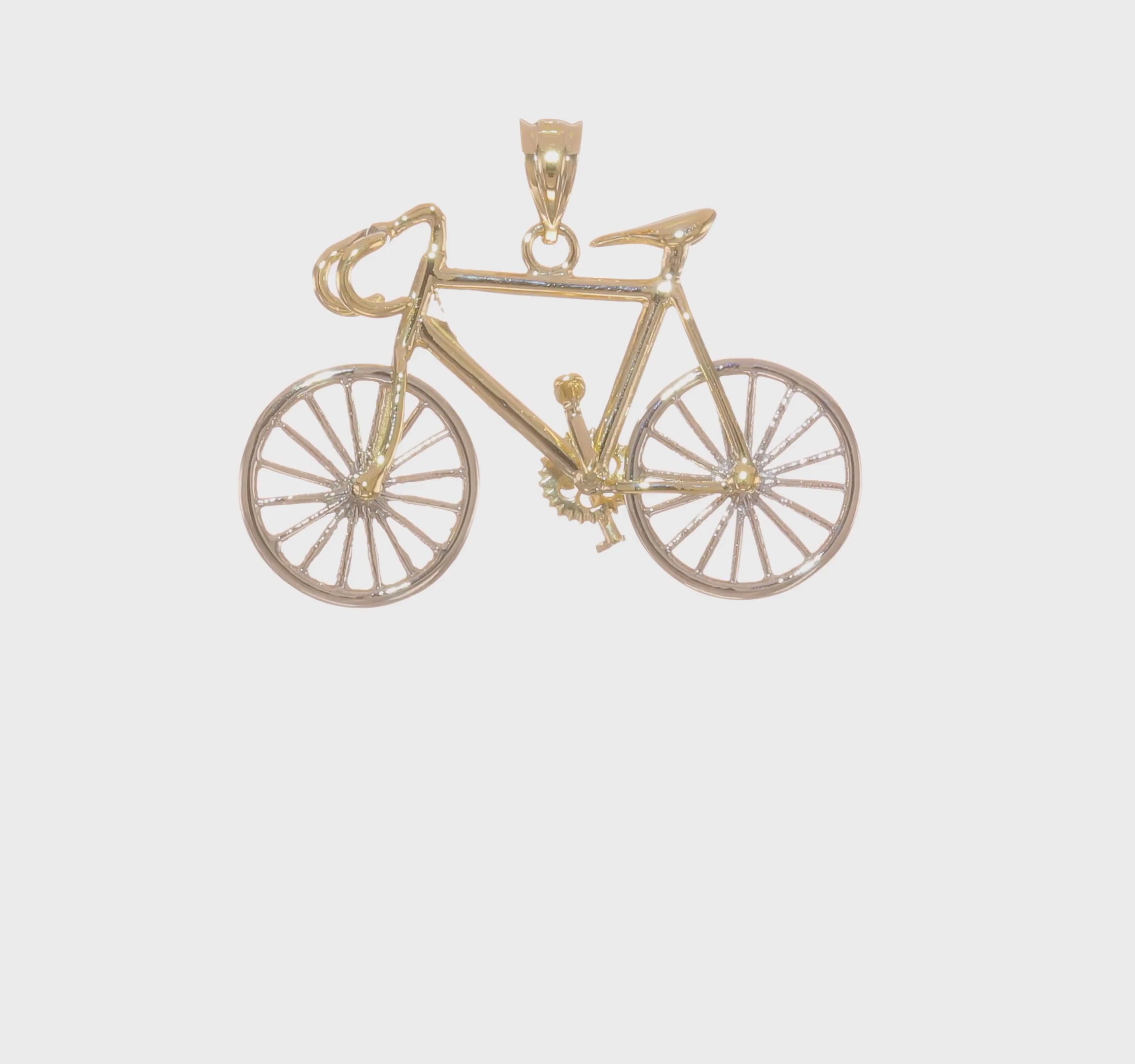 The Yellow and White Gold Large 3D Bicycle Pendant is expertly crafted from genuine 14K solid gold, featuring a realistic three-dimensional road bike with intricate details from the wheels to the handlebars. The combination of yellow and white gold adds striking contrast and depth to the design, highlighting the craftsmanship and making each element stand out. Measuring 26mm tall and 35mm wide, this pendant shines with a high-polish finish and vibrant golden tones. The bicycle is a symbol of freedom, adventure, and the pursuit of balance, making this gold bicycle pendant a meaningful accessory for cyclists and jewelry lovers alike. Tarnish-free and hypoallergenic, it’s perfect for everyday wear or as a standout gift for anyone passionate about cycling or unique gold jewelry.