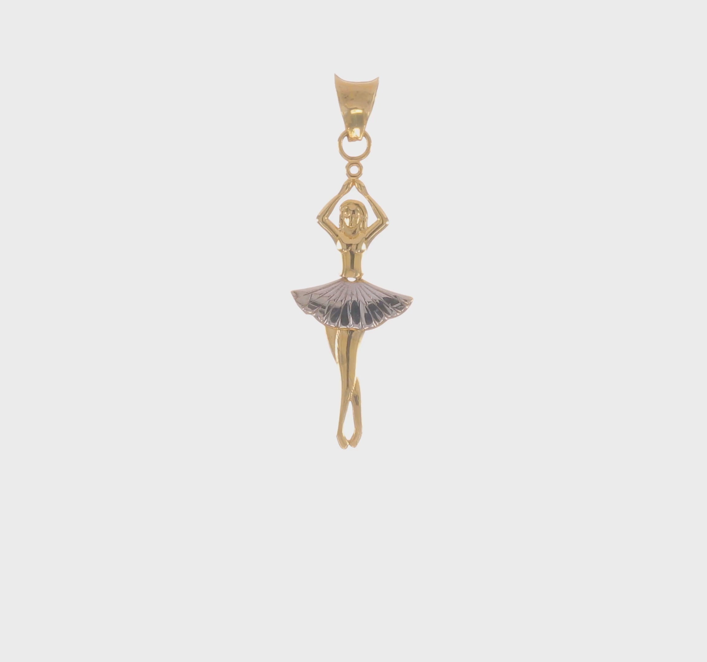 The Yellow and White Gold Moveable Dancer Pendant is crafted from genuine 14K solid gold, featuring a beautifully detailed ballerina with articulated, moveable limbs that capture the fluid motion of dance. The elegant contrast of yellow and white gold highlights the dancer’s form and adds dimension to the design. Measuring 22.5mm tall and 10.25mm wide, this pendant shines with a high-polish finish and exquisite craftsmanship. The dancer is a symbol of grace, artistry, and dedication, making this gold dancer pendant a meaningful accessory for ballet lovers and those inspired by the world of dance. Tarnish-free and hypoallergenic, it’s perfect for everyday wear or as a unique gift for dancer jewelry fans.