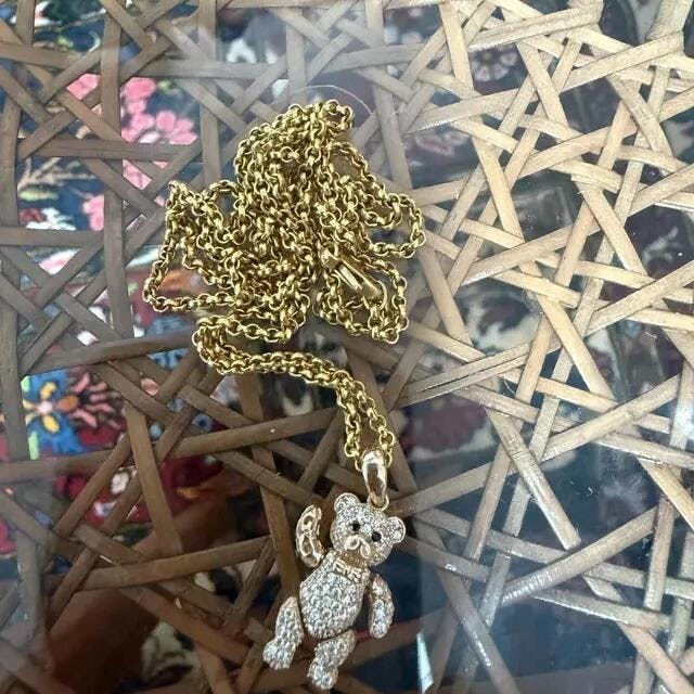 The Gold CZ Moving Teddy Bear Pendant is crafted from 14K solid gold with a high-polish finish, featuring a charming teddy bear adorned with sparkling cubic zirconia stones that add dazzling brilliance. Measuring 25mm long and 15mm wide, this lightweight pendant has a playful moving design that brings the bear to life. Symbolizing love, comfort, and joy, it makes a perfect gift or a delightful everyday accessory. Tarnish-free and hypoallergenic, it offers lasting shine and elegance.
