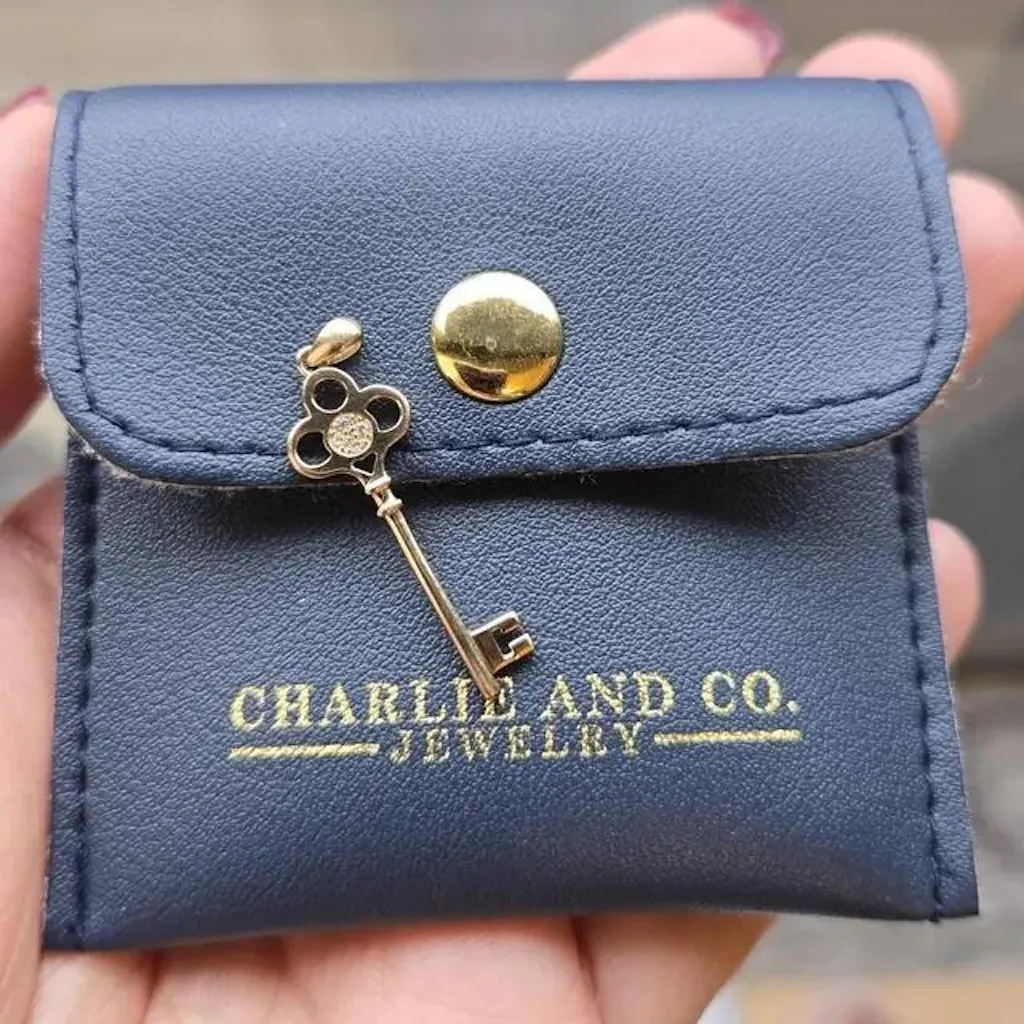 The Gold Key Pendant With Cubic Zirconia is a vintage-inspired piece crafted from 14K solid gold, featuring intricate details and a polished finish. The bow of the key is adorned with sparkling cubic zirconia stones, adding elegance and brilliance. This pendant symbolizes opportunity and unlocking new possibilities, making it a timeless accessory for any occasion. Its tarnish-free design and durable construction ensure lasting beauty.