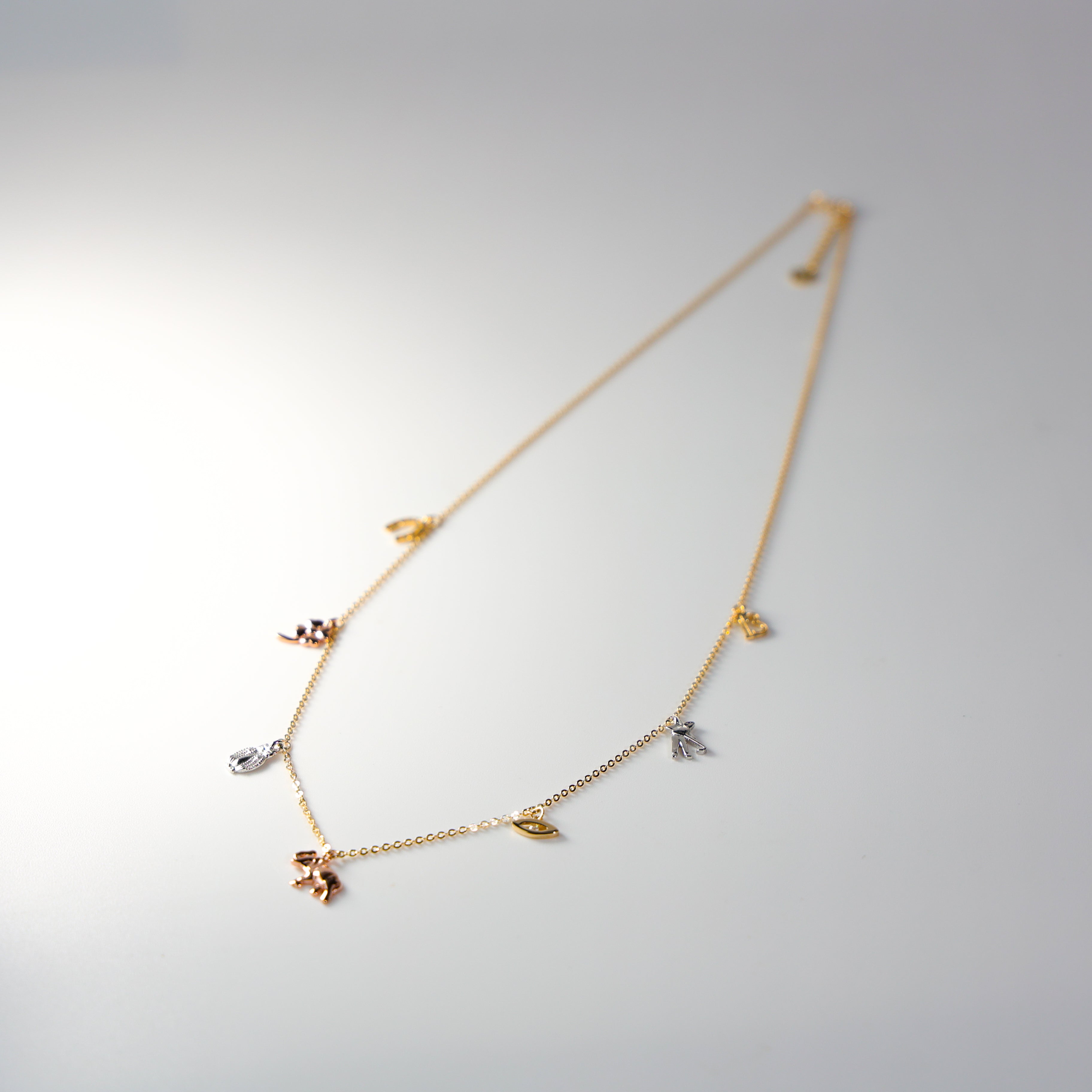 Gold Lucky Charms Necklace — This radiant 14K gold necklace features an array of symbolic charms suspended along a fine, adjustable chain (17–18 inches). Charms include a classic horseshoe, shining four-leaf clover, delicate heart, crescent moon, and sparkling evil eye, each polished to a brilliant finish. Together, these lucky charms represent good fortune, love, hope, and protection, making the gold lucky charms necklace a meaningful and playful accessory for daily wear or gifting. Hypoallergenic and tarnish-free, it’s designed for lasting shine and comfort without irritation.